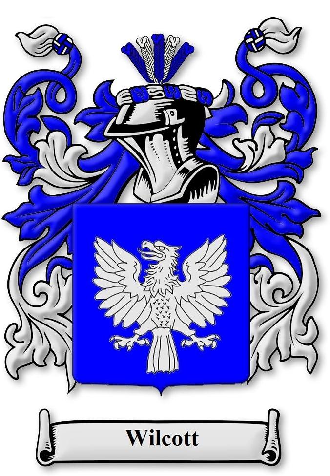 During the reign of Henry VIII (1509-1547), the College of Arms recorded arms for "Walcott: Per pale Azure and Gules on a cross patonce five martlets Sable on a chief Or a fleur de lis between two annulets Gules. Crest: A griffin head guttee de sang holding in its beak a fleur de lis charges with three bezantes".
