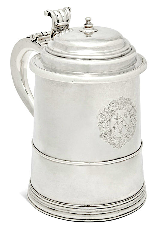 The tankard of Gov. Roger Wolcott shown above sold at a Southby’s auction in 2023 as Lot 803; "An American Silver Tankard with the Wolcott Arms, William Cowell, Sr., Boston, circa 1730. Provenance: Governor Roger Wolcott of Connecticut and his wife, Sarah, by descent in the Wolcott family, until 1979, when it was sold to the Wolf family." The Walcot coat-of-arms has been used by the Society of Descendants of Henry Wolcott for the past 120 years as its official emblem.